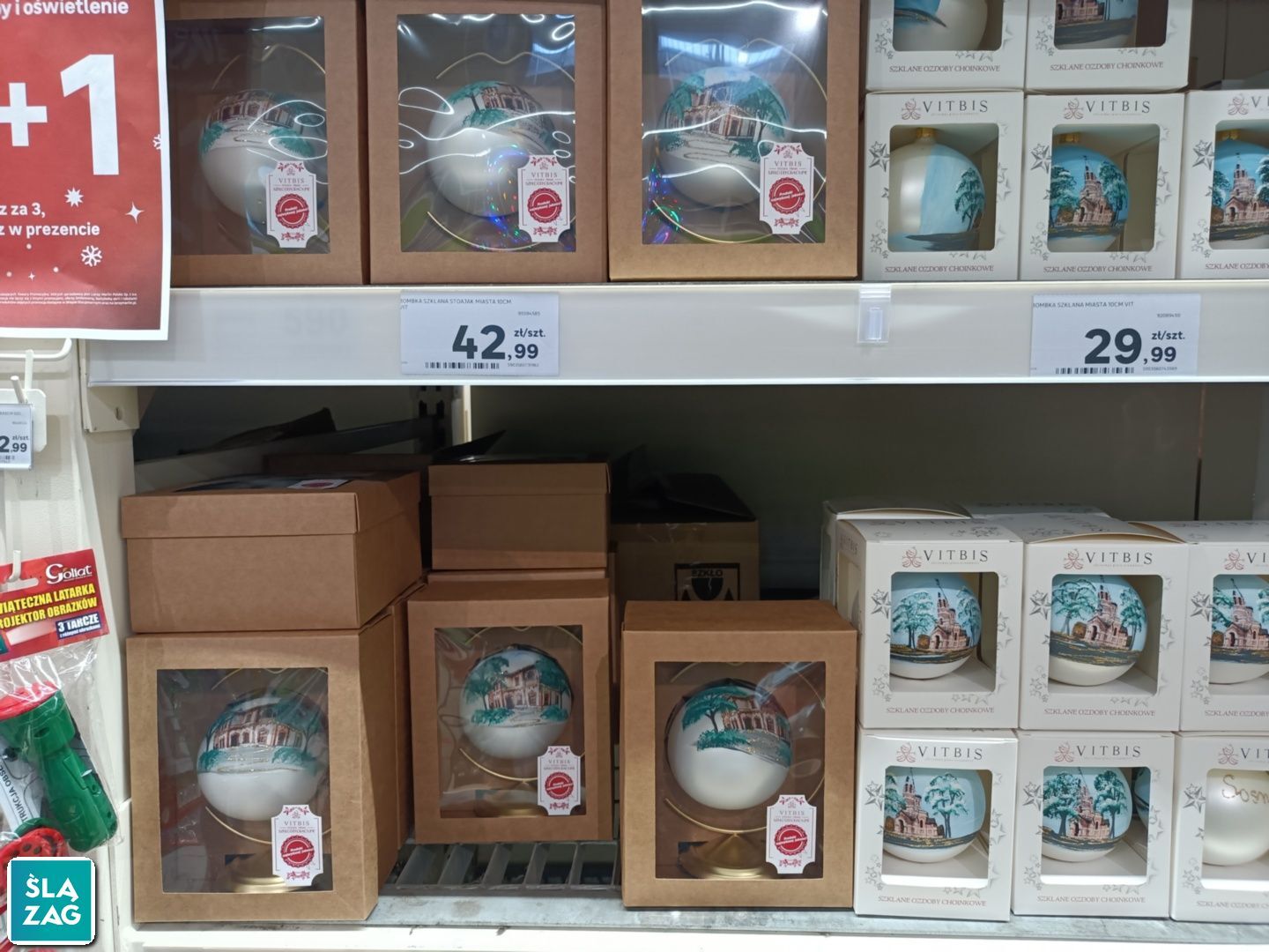 Cena to niecałe 30 zł za bombkę w ładnym opakowaniu, zaś niecałe 43 zł trzeba wydać na bombkę ze stojakiem w pudełku z szybką. Pewnym ograniczeniem jest fakt, że określone wzory są oferowane tylko w konkretnym zestawie, czyli – jeśli bombka jest oferowana ze stojakiem, to nie można jej kupić bez niego. I vice versa.