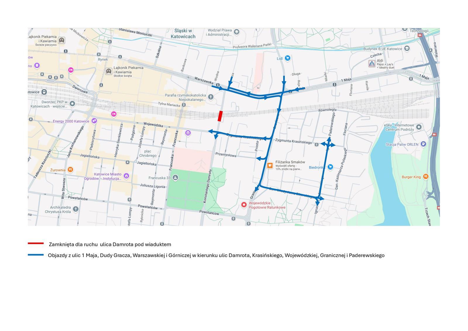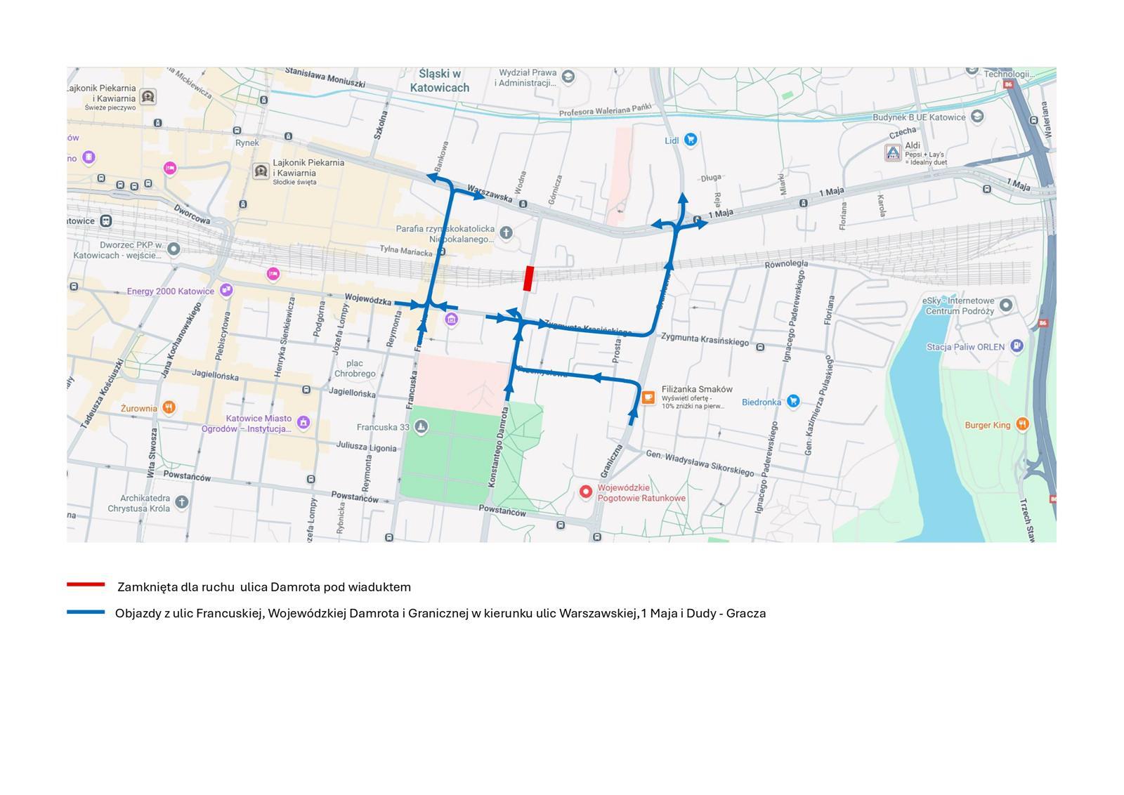Na łączeniu ul. Dudy-Gracza będzie można jeździć na wprost ul. Graniczną. Pojazdy jadące ul. 1 Maja nie będą mogły skręcić w lewo na Graniczną, będą musiały na skrzyżowaniu z ul. Damrota zawrócić, by w prawo wjechać w ul. Graniczną.