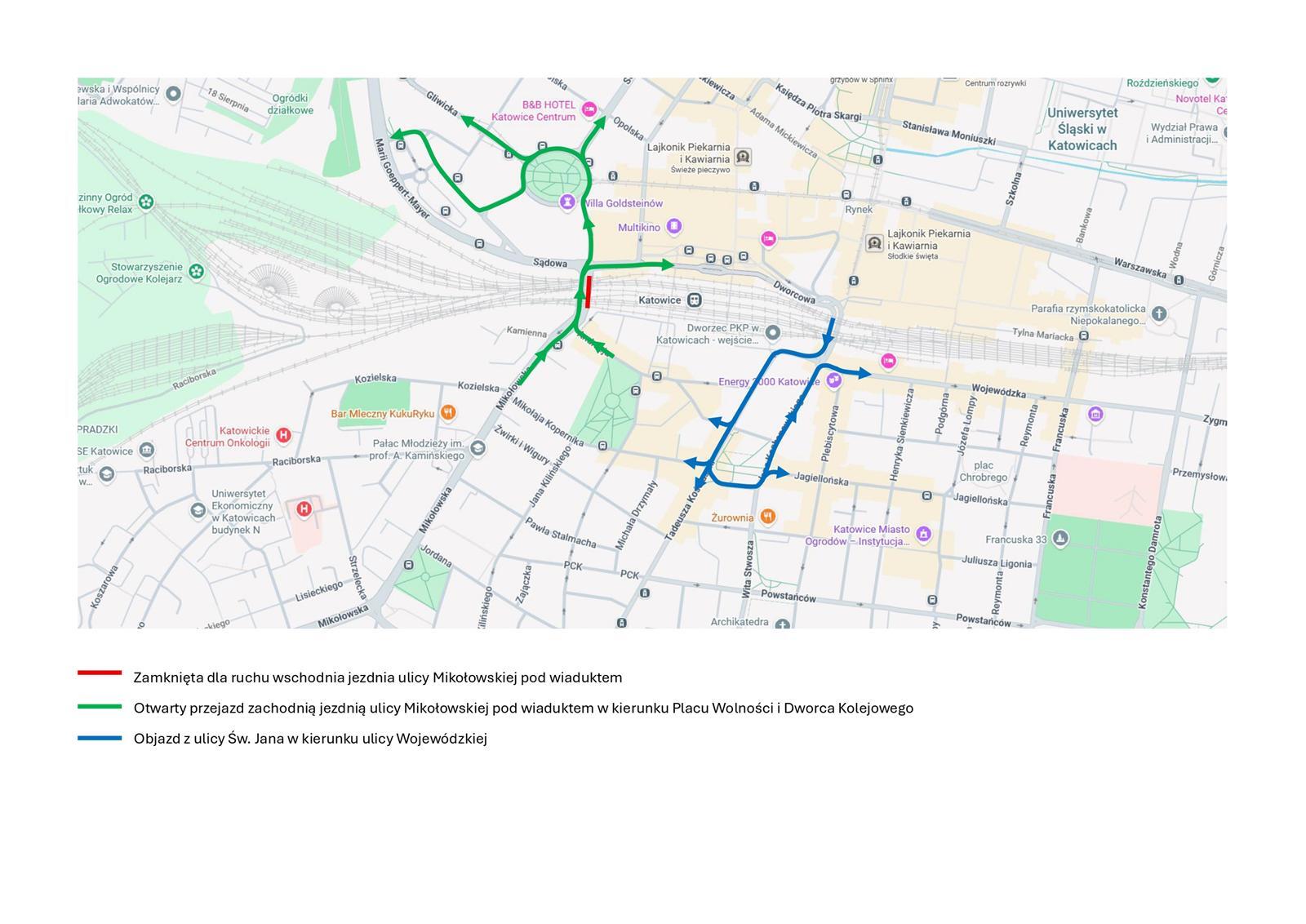 Dla ruchu będzie otwarta tylko jezdnia wschodnia, czyli ta od strony dworca Sądowa. Będzie możliwy ruch samochodów tylko w stronę placu Wolności (czyli na wprost) i w ul. Słowackiego i tunelu pod Galerią Katowicką (czyli skręt w prawo). Nie będzie możliwości skrętu w lewo w ul. Goeppert-Mayer.