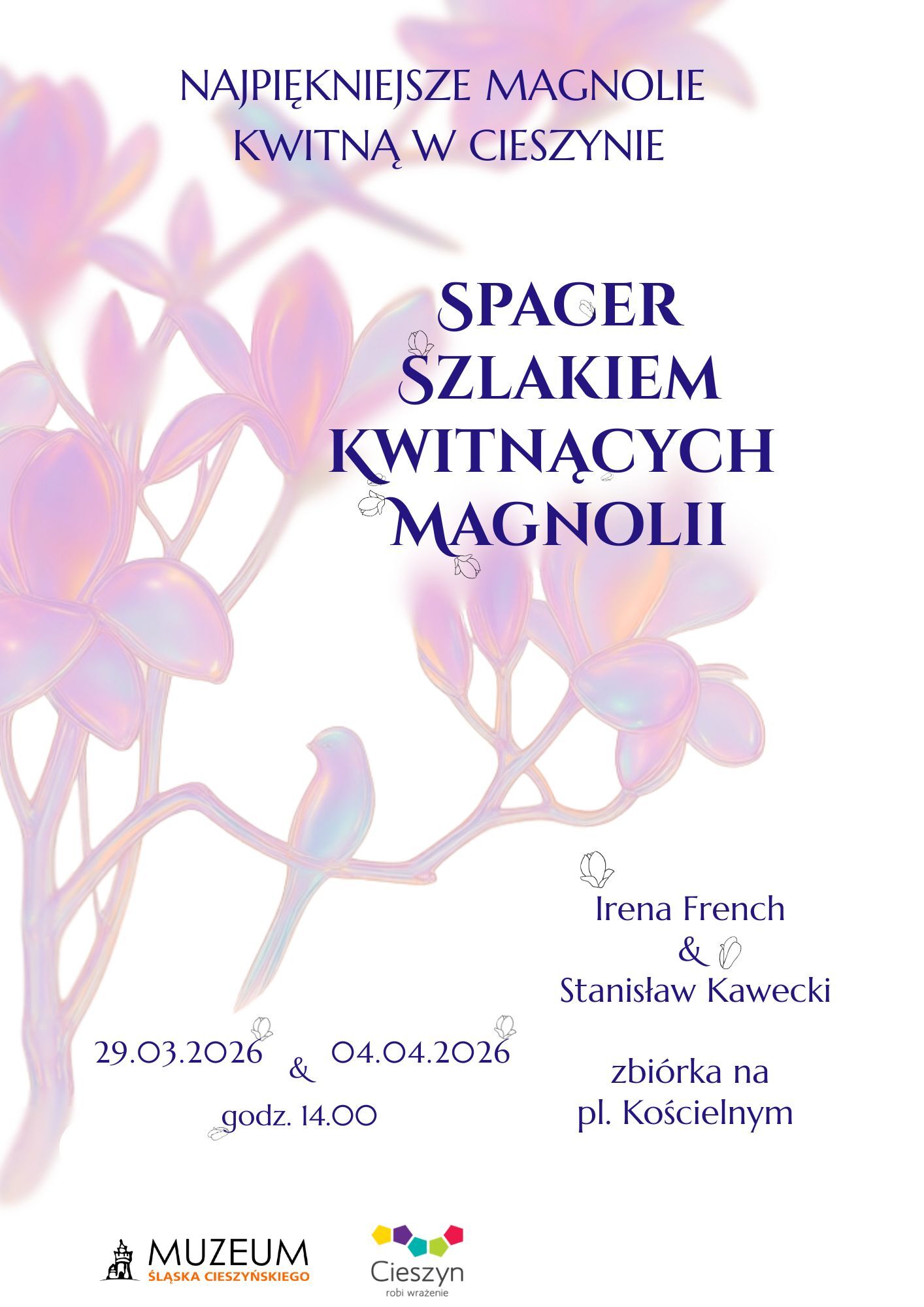 Muzeum Śląska Cieszyńskiego oraz Miasto Cieszyn zapraszają wiosenny spacer Szlakiem Kwitnących Magnolii. Tej wiosny miłośnicy przyrody będą mogli nim przejść w dwóch terminach - 29 marca 2026 roku i w Wielką Sobotę, 4 kwietnia 2026 roku. Oba spacery rozpoczną się o godzinie 14.00 na pl. Kościelnym w Cieszynie, a o fascynujących tajemnicach magnolii opowiadał będzie Stanisław Kawecki, Sekretarz Miasta Cieszyna. Potowarzyszy mu Irena French, Dyrektorka Muzeum Śląska Cieszyńskiego, która opowie o dawnych dziejach Cieszyna.