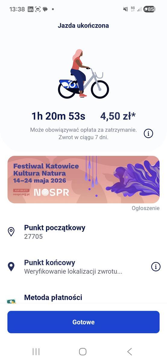 Oddaję metrorower. Okazuje się, że moja rajza (z przerwą na konsumpcję i podziwianie przyrody) trwała godzinę i 20 minut, co kosztowało mnie zawrotną kwotę 4,5 zł (plus lody).