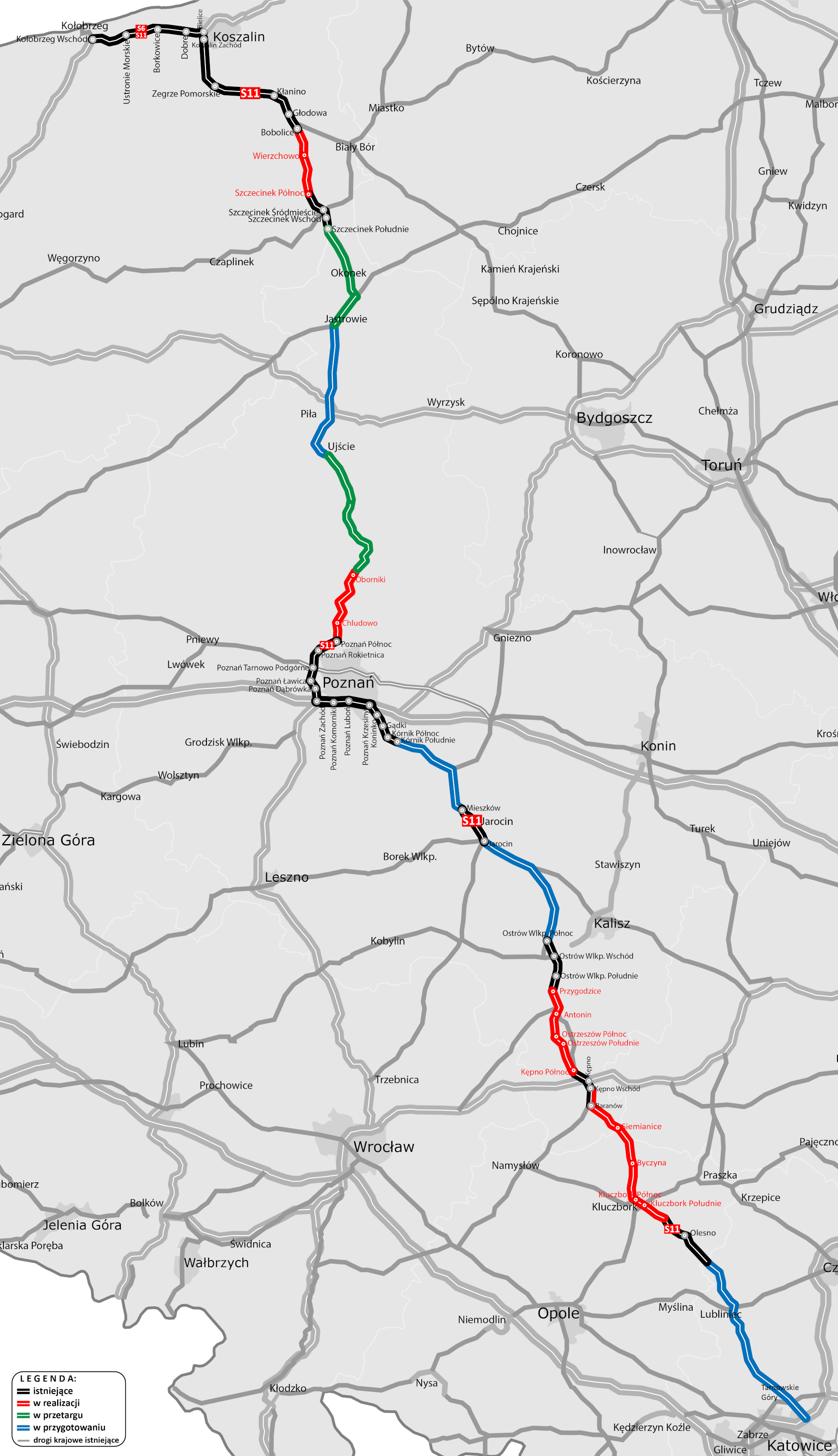 Docelowo pokonanie trasy z Kołobrzegu do węzła Piekary Śląskie na połączeniu z autostradą A1 zajmie samochodem osobowym nieco ponad 5 godz. Dziś kierowcy mogą skorzystać z kilku istniejących fragmentów tej trasy. To wspólny przebieg z S6 od Kołobrzegu do Koszalina (ok. 35 km) i autostradą A2 na obwodnicy Poznania (ok. 16 km). W ciągu S11 oddano do ruchu trasę od Koszalina do Bobolic, obwodnicę Szczecinka, odcinki w okolicy Poznania oraz cztery kolejne obwodnice: Jarocina, Ostrowa Wielkopolskiego, Kępna i Olesna.